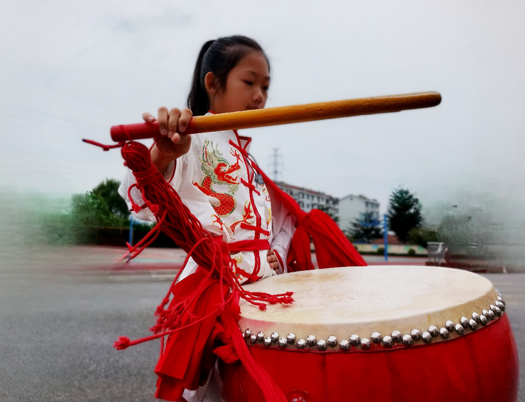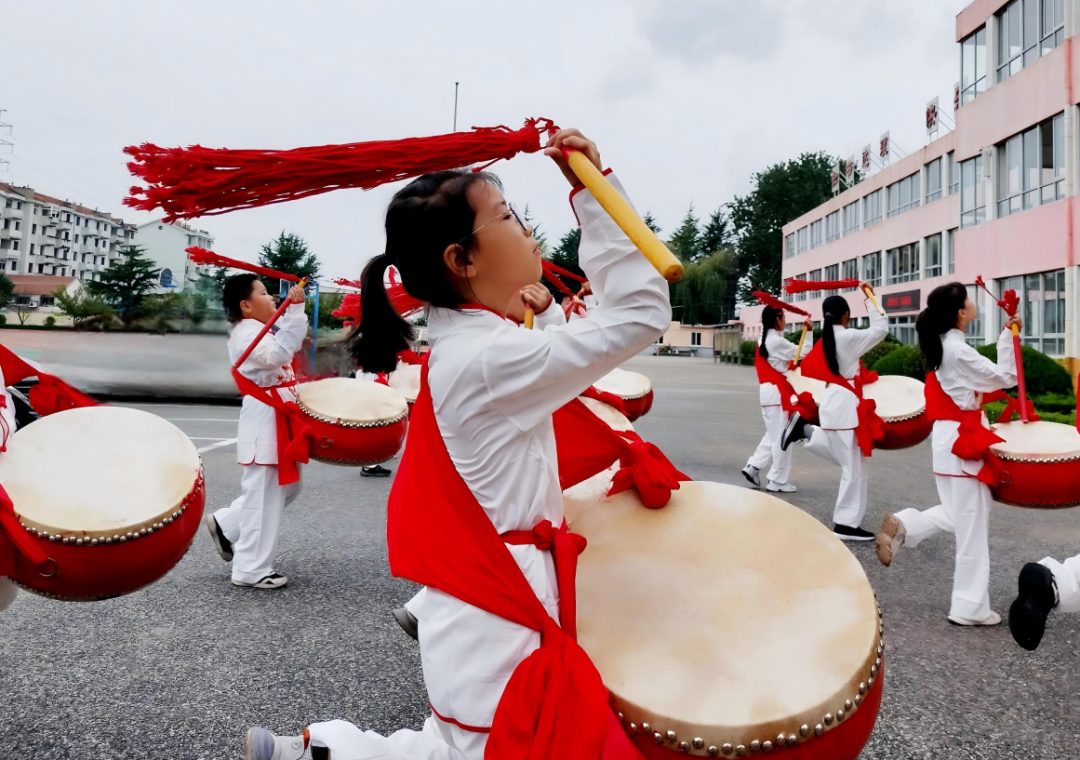 红绸飘扬,鼓声震天。芝罘区上坊小学的操场上,一群身着白衣的少年们背着十多斤重的庙鼓,右手持槌,翻花甩穗,落槌有力的铿锵节奏在校园里声声回荡。