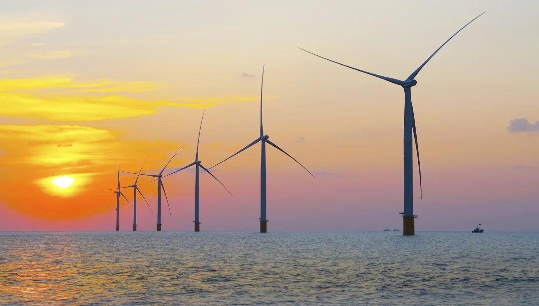 距岸10余海里的海域,一座座百米高的风力发电机巍然矗立,悠悠转动恰似揽风挽云,勾勒出海上风电的壮美图景。