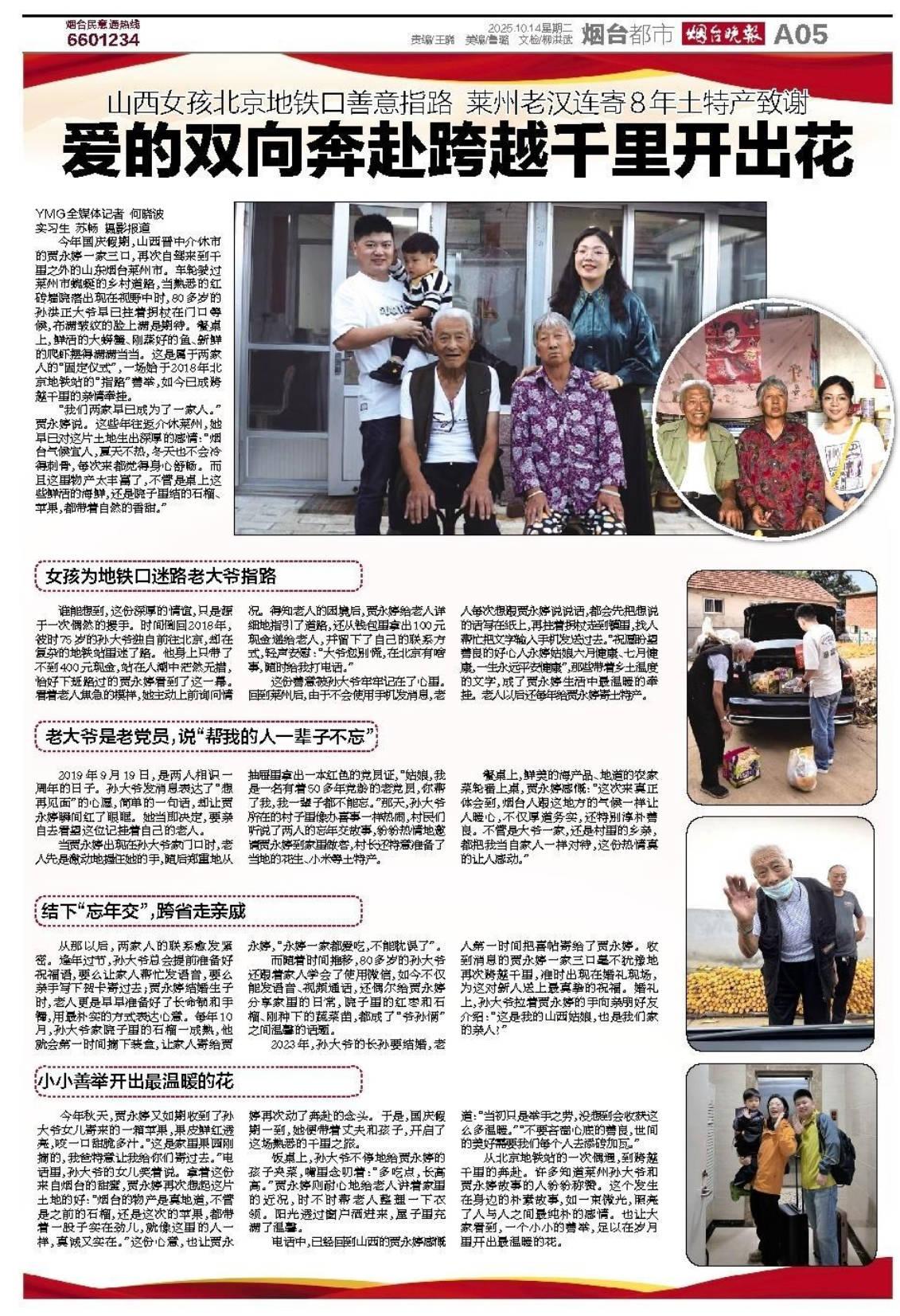 北京地铁口一次指路,山西姑娘递出100元;山东莱州老汉记了八年,年年寄去烟台的石榴与苹果。这场跨越千里的“双向奔赴”,把微小善意酿成了岁月里最甜的酒。